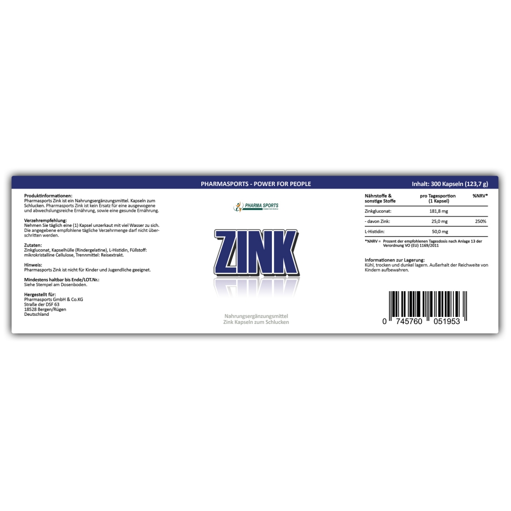 Zink L-Histidin Komplex - Dose á 300 Kapseln. Pharmasports Zink ist Ihre Quelle für wertvolles Zinkgluconat in Kombination mit L-Histidin. Pro Tagesportion (1 Kapsel) finden sich 25 Milligramm hochwertiges Zink, sowie 50 Milligramm L-Histidin. Pro Dose sind 300 Kapseln enthalten, welche zugleich 300 Tagesportionen á 1 Kapsel darstellen.