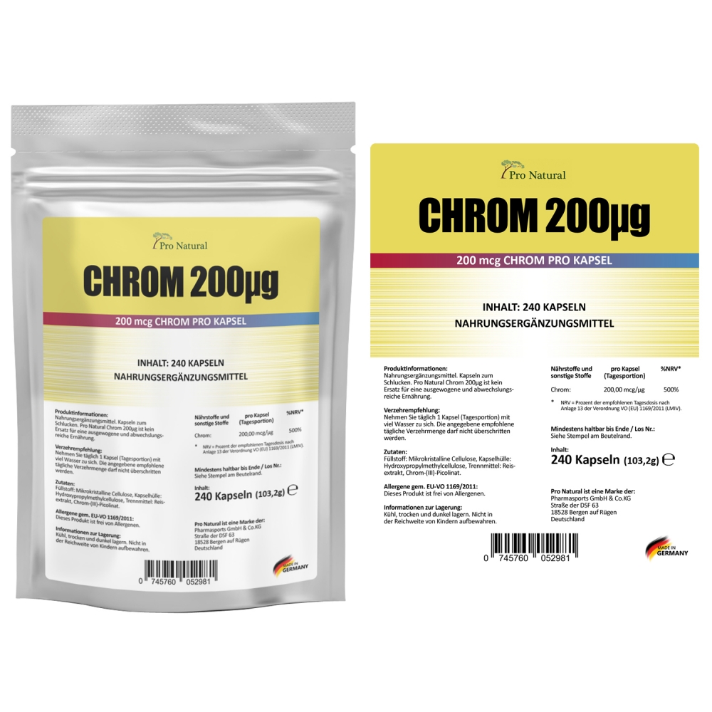 Pro Natural Chrom 200µg - Standbeutel á 240 Kapseln. Chrom 200µg ist Ihre Quelle für wertvolles Chrom in der einfachen und bequemen Kapselvariante. Durch die pflanzliche HPMC-Kapselhülle ist Pro Natural Chrom 200µg auch für Veganer, sowie Vegetarier geeignet. Pro Standbeutel sind 240 vegane Kapseln enthalten, die zugleich 240 Tagesportionen á 1 Kapsel entsprechen. Geliefert wird Pro Natural Chrome in einem wiederverschließbaren, lichtundurchlässigen Standbeutel. Wie es der Name bereits schon verrät, enthält diese hochwertige Nahrungsergänzung 200 µg/mcg (Mikrogramm) reines Chrom-(III)-Picolinat.