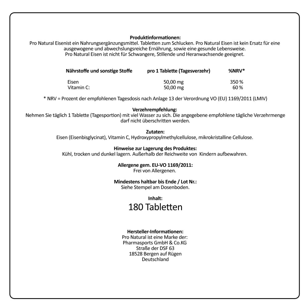 Pro Natural bietet Ihnen mit dieser hochwertigen Nahrungsergänzung den wichtigen Mineralstoff Eisen in bequemer Tabletten Form an. Eine Packung Pro Natural Eisen enthält 180 Tabletten. Mit Pro Natural Eisen können Sie Ihren Körper bei einem bestehenden Mangel oder als Vorsorge mit dem wichtigen Mineralstoff unterstützen.