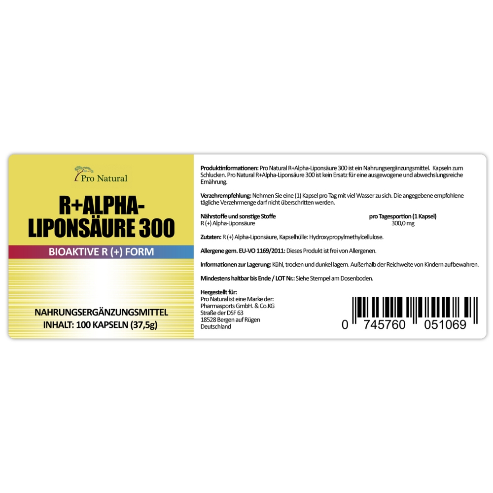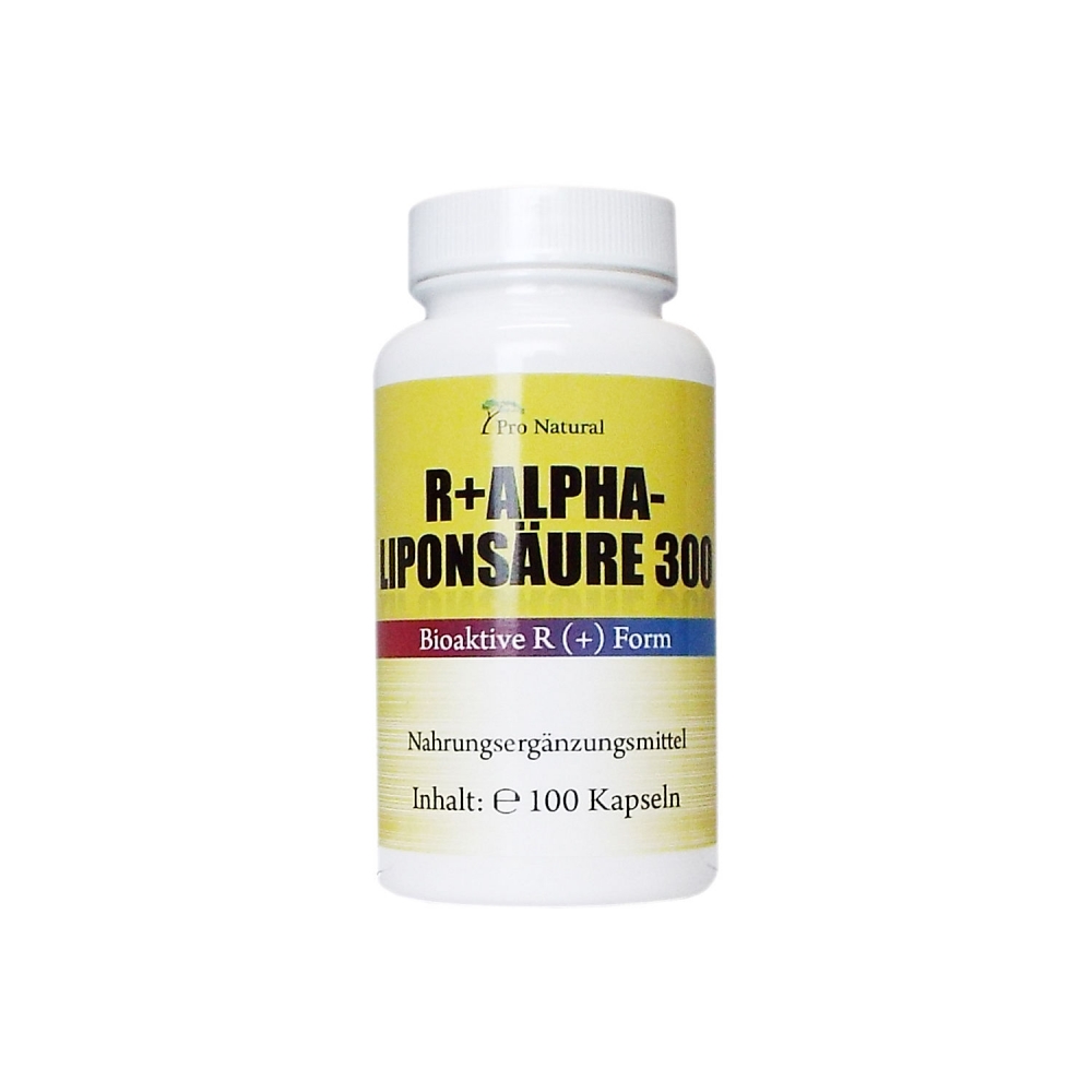 Pro Natural R+Alpha-Liponsäure 300 - Dose á 100 Kapseln. Pro Natural bietet Ihnen mit Pro Natural R+Alpha-Liponsäure 300 die bioaktive R (+) Form der bekannten und beliebten Alpha-Liponsäure. Pro Kapsel finden 300 Milligramm reine R (+) Alpha-Liponsäure.Bei Alpha-Liponsäure handelt es sich um eine schwefelhaltige Fettsäure, die im Körper des Menschen von Natur aus ihr Vorkommen findet. Das heißt, dass der menschliche Körper Alpha-Liponsäure selbst bildet. Alpha-Liponsäure ist nicht nur wasser-, sondern auch fettlöslich. Zudem wird Alpha-Liponsäure im Magendarm-Kanal hervorragend resorbiert und bringt die Eigenschaft mit sich, sich schnell im gesamten Körper zu verteilen. Unterschieden wird Alpha-Liponsäure in 2 unterschiedliche Formen. So gibt es zum einen die preiswerte Form, welche als S(-)-Alpha-Liponsäure bezeichnet wird, sowie die hochwertigere und biologisch besser verfügbare Form - R(+)-Alpha-Liponsäure. Im Bereich der Nahrungsergänzung ist Alpha-Liponsäure meist in Form von Kapseln zu finden.