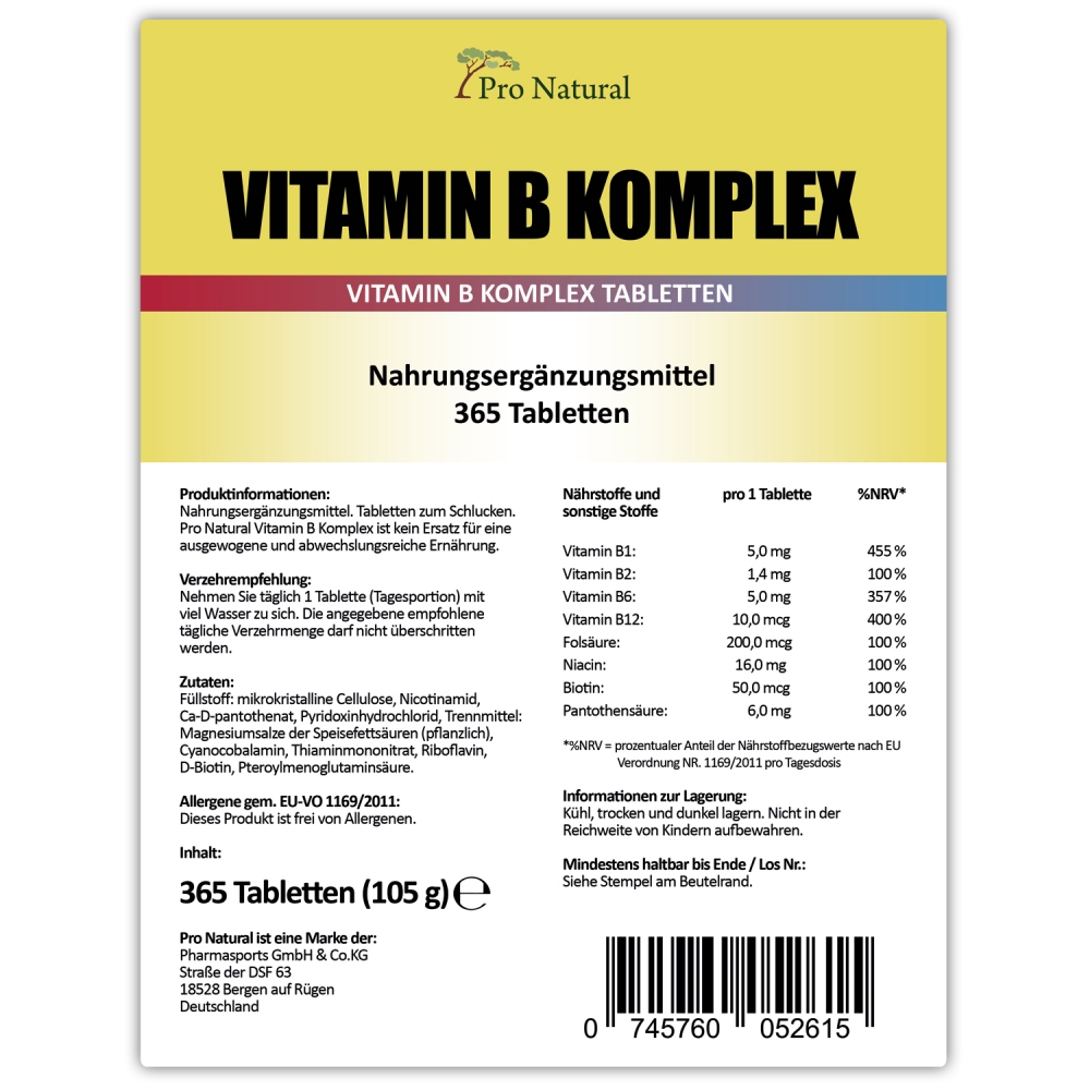 Pro Natural Vitamin B Komplex - Standbeutel á 365 Tabletten. Pro Natural Vitamin B Komplex ist Ihre hochwertige Quelle für wertvolle B-Vitamine in der einfachen und bequemen Tablettenform. Enthalten sind 365 Tabletten, welche Sie neben Vitamin B1, Vitamin B2 noch mit weiteren Vitamin versorgt. Durch die einfache und bequeme Tablettenvariante gehören aufwendige Zubereitungen bei diesem Produkt der Vergangenheit an. Geliefert wird Pro Natural Vitamin B Komplex in einen wiederverschließbaren, lichtundurchlässigen Standbeutel. B-Vitamine finden sich auch in unserer täglichen Nahrung. So gehören beispielsweise Nahrungsmittel wie Feldsalat, Austern, Sesamsamen, Huhn oder Grünkohl zu den effektivsten Quellen für B-Vitamine. Wer seinen täglichen Bedarf an B-Vitaminen nicht über die tägliche Nahrung gedeckt bekommt, dem bleibt immer noch die Möglichkeit, diesen über Nahrungsergänzungsmittel abzudecken. Neben Kapseln oder Pulver, wird der tägliche Bedarf oftmals auch über Tabletten abgedeckt. Vitamin B12 hingegen wird von einigen Anwendern sogar in Form von Injektionen genutzt.