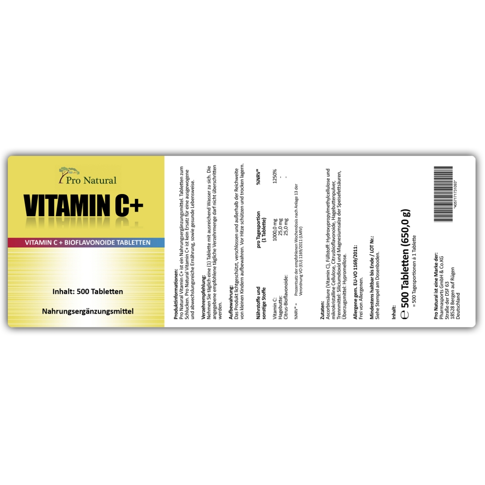 Pro Natural Vitamin C+ ist Ihre Quelle für hochwertiges Vitamin C, in Kombination mit zusätzlicher Hagebutte, sowie Citrus-Bioflavonoide. Bei Pro Natural Vitamin C+ handelt es sich um ein Retard Tablettenprodukt, welches pro Tablette 1000mg Vitamin C, 25mg Hagebutte, sowie 25mg Citrus-Bioflavonoide mit sich bringt. Durch die einfache und bequeme Tablettenvariante gehören aufwendige Zubereitungen bei diesem Produkt der Vergangenheit an. Pro Dose sind 500 Tabletten enthalten, welche zugleich 500 Tagesportionen á 1 Tablette entsprechen. Vitamin C gehört ganz klar zu den bekanntesten Vitaminen überhaupt, welches vielen auch unter der Bezeichnung "Ascorbinsäure" bekannt ist.