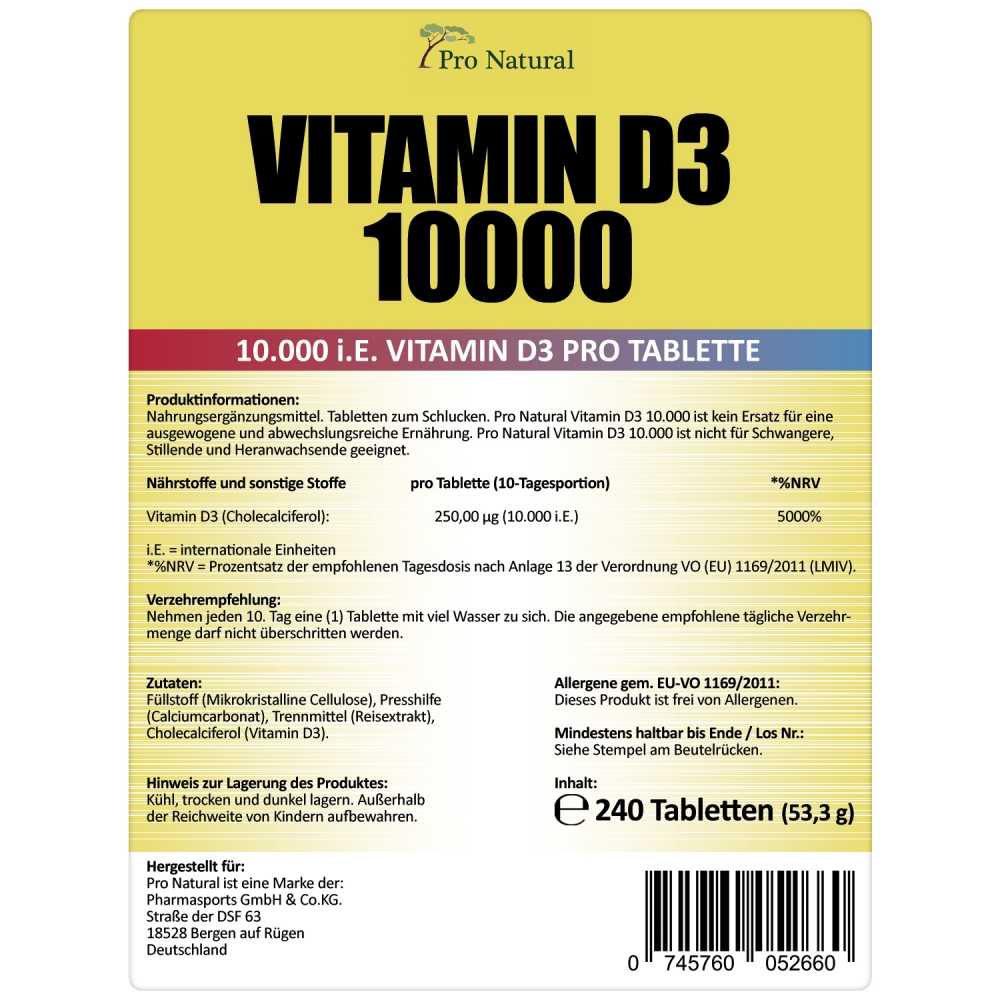 Pro Natural Vitamin D3 10000 - Standbeutel á 240 vegetarische Tabletten. Pro Natural Vitamin D3 10000 ist Ihre Quelle für hochwertiges Vitamin D3 in einer einfacher und bequemer Tablettenform. Durch die einfache Tablettenvariante wird nicht nur die Einnahme deutlich vereinfacht, sondern zudem auch eine möglichst genaue Dosierung ermöglicht. Pro Tablette finden sich in dieser hochwertigen Nahrungsergänzung unglaubliche 10000 internationale Einheiten reines Vitamin D3. Bei Pro Natural Vitamin D3 10000 handelt es sich um ein Produkt, welches von Vegetarier, genutzt werden kann.