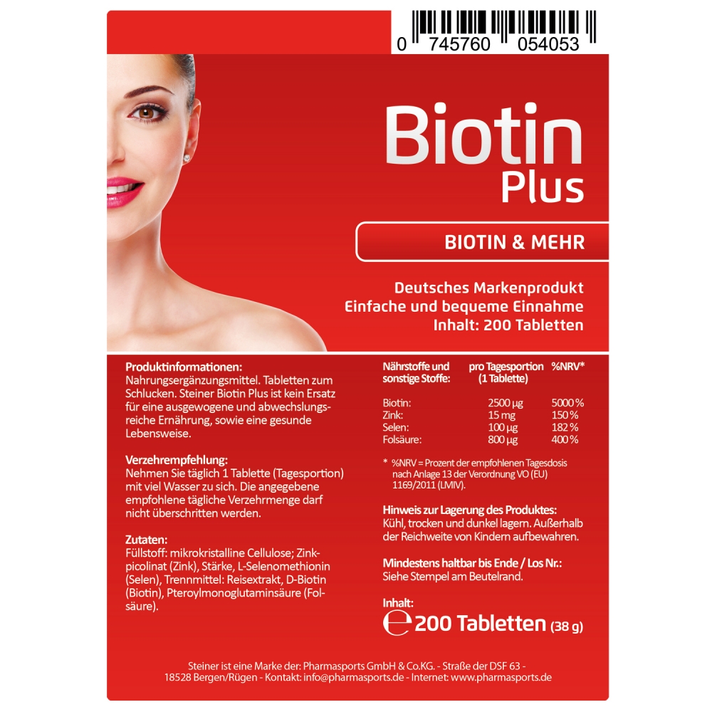 Steiner Biotin Plus - wiederverschließbarer Standbeutel mit einem Inhalt von 200 Tabletten. Steiner Biotin Plus ist ein hochwertiges Nahrungsergänzungsmittel, welches Sie neben Biotin mit zusätzlichem Zink, Selen sowie Folsäure in der Tablettenvariante unterstützt. Durch die bequeme Tablettenvariante wird nicht nur die Einnahme deutlich vereinfacht, sondern zudem auch eine möglichst genaue Dosierung des Produktes ermöglicht.