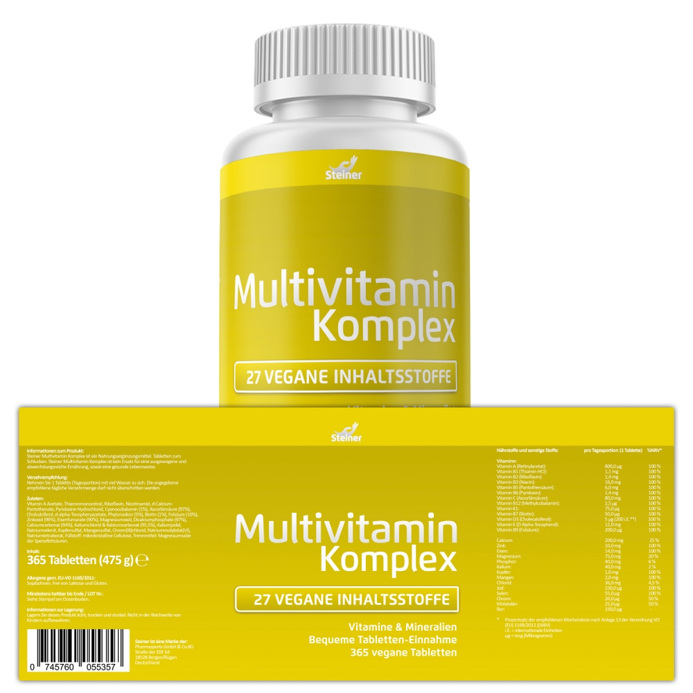 Steiner Multivitamin Komplex – Standdose á 365 Tabletten. Steiner Multivitamin Komplex ist Ihre Quelle für Vitamine, Mineralien, Spurenelemente und Antioxidantien in der einfach und bequemen Tablettenform. Jede enthaltene Zutat wurde in diesem Nahrungsergänzungsmittel im optimalen Verhältnis zur nächsten Zutat eingebunden. Pro Standdose sind 365 Tabletten enthalten, welche 365 Tagesportionen á 1 Tablette entsprechen. Geliefert wird Steiner Multivitamin Komplex in einer lichtundurchlässigen, wiederverschließbaren Standdose, welche sich für eine optimale Lagerung des Produktes eignet. Die Einnahme von Steiner Multivitamin Komplex eignet sich für männliche, wie auch weibliche Anwender und erfolgt täglich (1 Tablette) mit viel Wasser.