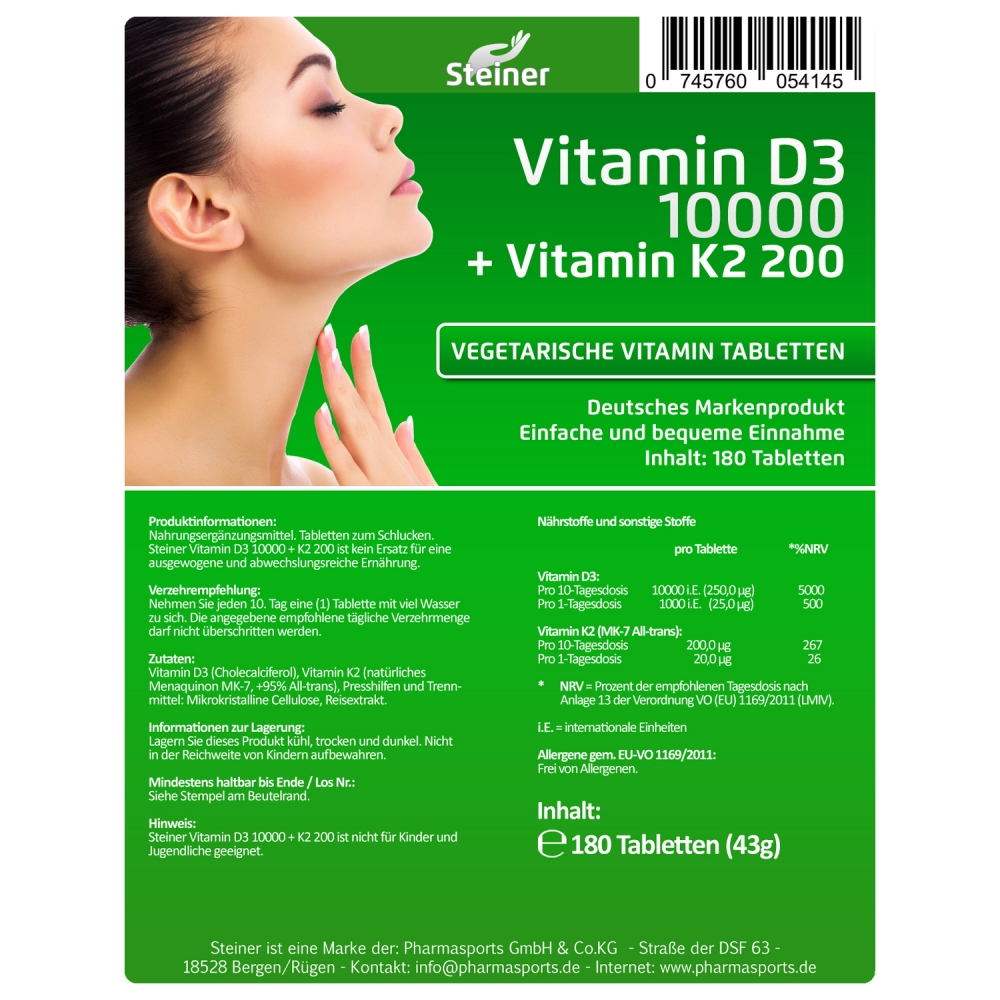 Steiner Vitamin D3 10000 + Vitamin K2 200 - Standbeutel á 180 Tabletten. Steiner Vitamin D3 10000 + Vitamin K2 200 ist Ihre Quelle für wertvolles Vitamin D3, sowie Vitamin K2 im optimalen Verhältnis. Pro Tablette findet sich in dieser hochwertigen Nahrungsergänzung 250 mcg/µg (Mikrogramm) Vitamin D3, welches 10000 i.E. (internationale Einheiten) entspricht, sowie 200 mcg/µg (Mikrogramm Vitamin K2).