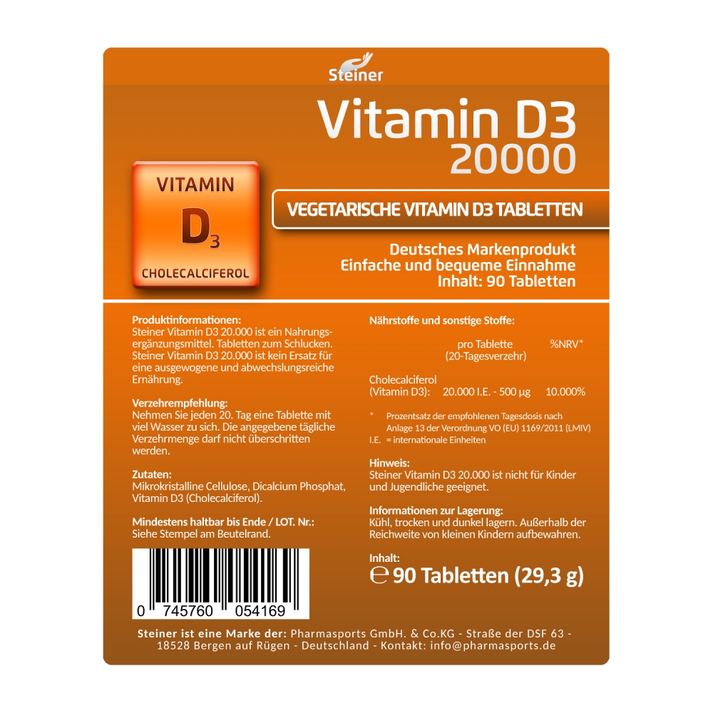 Steiner Vitamin D3 20.000 - Standbeutel á 90 Tabletten. Steiner Vitamin D3 20.000 ist ein vegetarisches Tablettenprodukt, dass Sie pro Tablette mit 20.000 i.E. (internationale Einheiten) Vitamin D3 versorgt.